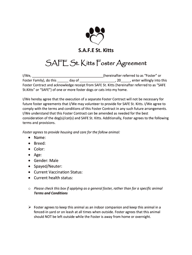 S.A.F.E St. KittsSAFE St. Kits Foster Agreement I/We, (hereinafter referred to as Foster or Foster Family), do this day of, 20, enter willingly into this Foster Contract and acknowledge receipt from