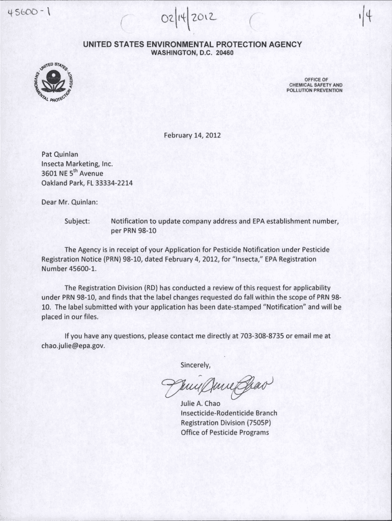 UNITED STATES ENVIRONMENTAL PROTECTION AGENCY WASHINGTON, D.C. 20460oOFFICE OF CHEMICAL SAFETY AND POLLUTION PREVENTION February 14, 2012, Pat Quinn Insects Marketing, Inc. 3601 NE 5th Avenue Oakland