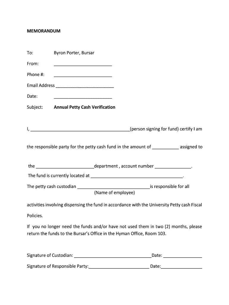 Memorandum:Byron Porter, BursarFrom: Phone #: Email Address Date: Subject:Annual Petty Cash Verification, (person signing for fund) certify I am the responsible party for the petty cash fund in the