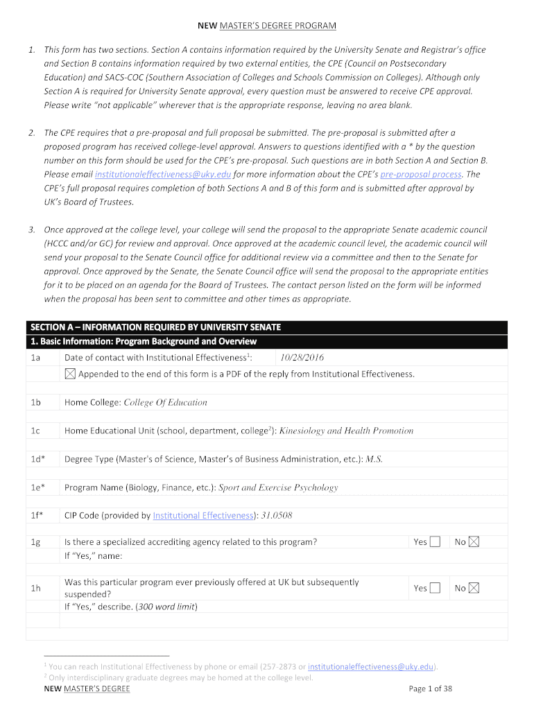 1. This form has two sections. Section A contains information required by the University Senate and Registrars office