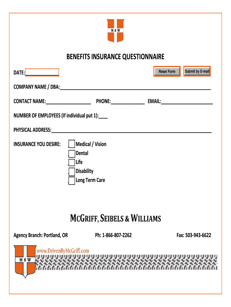 Get the free Benefits Insurance Questionnaire