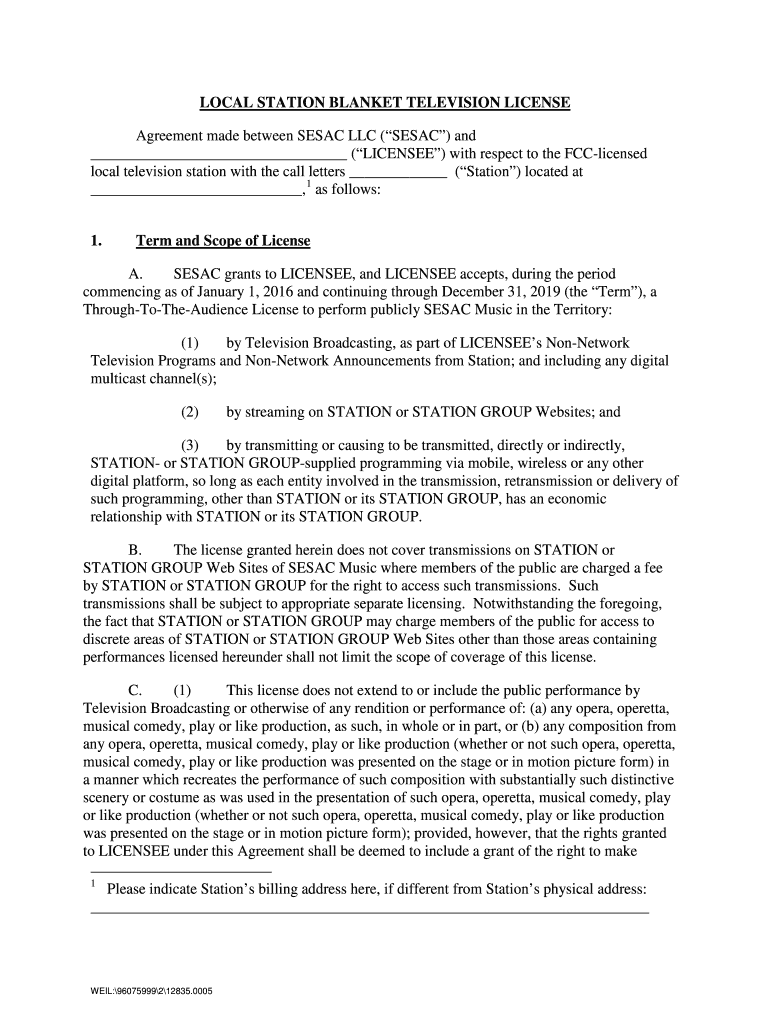 LOCAL STATION BLANKET TELEVISION LICENSE Agreement made between SEAC LLC (SEAC) and (LICENSEE) with respect to the FCC licensed local television station with the call letters (Station) located at,