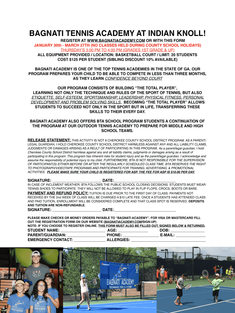 MAGNATE TENNIS ACADEMY AT INDIAN KNOLL! REGISTER AT WWW.BAGNATIACADEMY.COM OR WITH THIS FORM JANUARY 30th MARCH 27TH (NO CLASSES HELD DURING COUNTY SCHOOL HOLIDAYS) THURSDAYS 3:00 PM TO 4:00 PM (GRADES