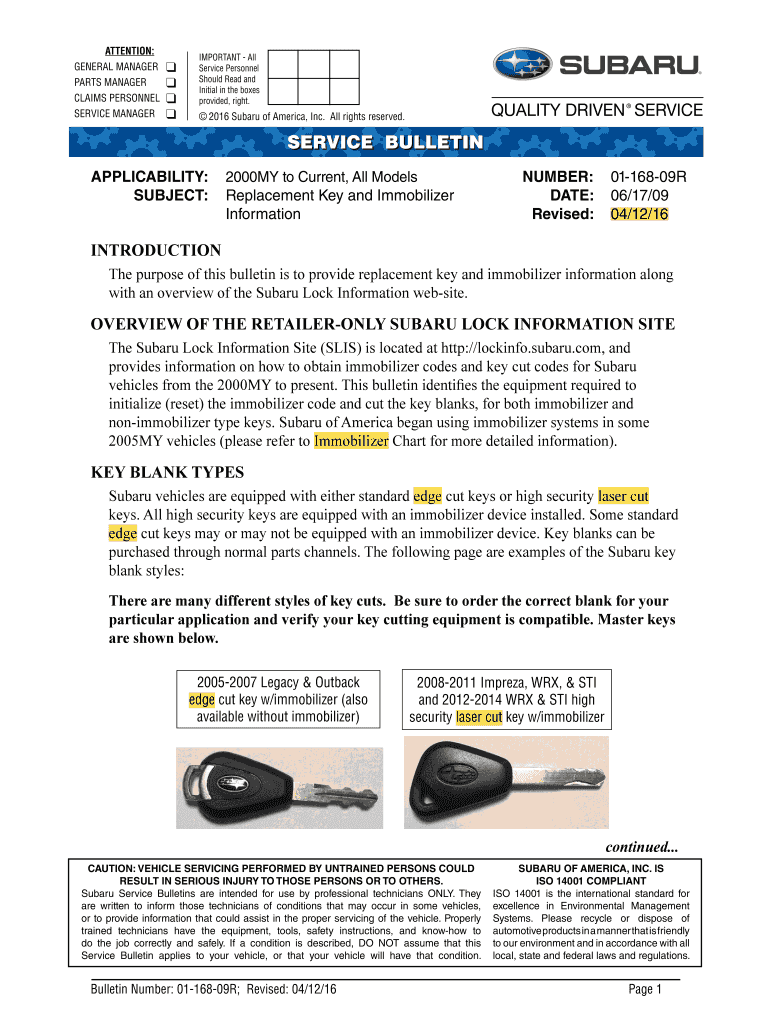 ATTENTION:CLAIMS PERSONNELqIMPORTANT All Service Personnel Should Read and Initial in the boxes provided, right. SERVICE Manager 2016 Subaru of America, Inc. All rights reserved. GENERAL Manager PARTS