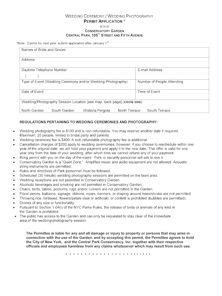 WEDDING CEREMONY / WEDDING PHOTOGRAPHY PERMIT APPLICATION * CONSERVATORY GARDEN TH CENTRAL PARK, 105 STREET AND FIFTH AVENUE *Note: Events for next year, submit application after January 1stNames