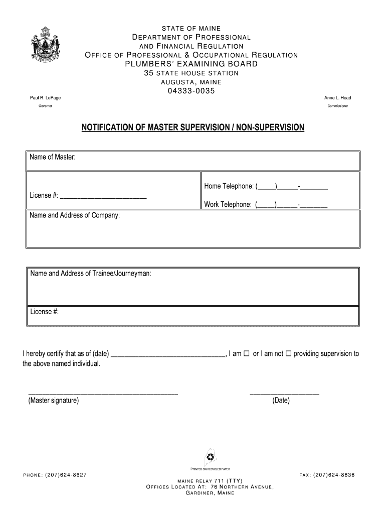STATE OF MAINE DEPARTMENT OF PROFESSIONAL AND FINANCIAL REGULATION OFFICE OF PROFESSIONAL & OCCUPATIONAL REGULATIONPLUMBERS EXAMINING BOARD 35 S T A T E H O U S E S T A T I O N AUGUSTA, MAINE 043330035