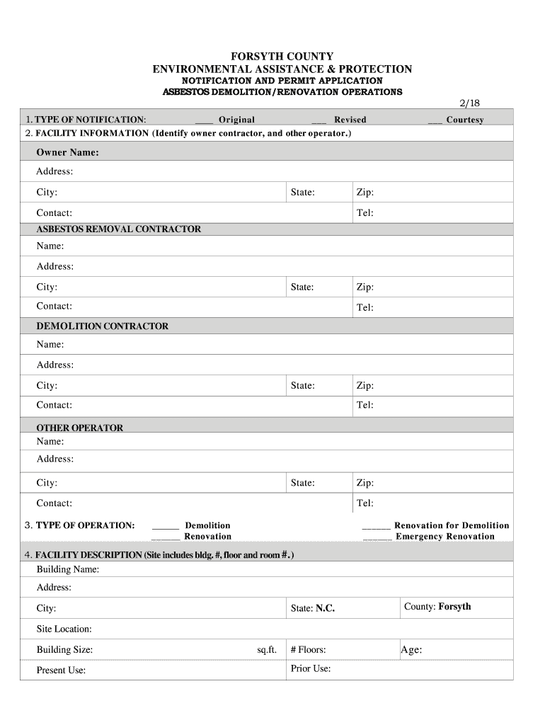 FORSYTH COUNTY ENVIRONMENTAL ASSISTANCE & PROTECTION NOTIFICATION AND PERMIT APPLICATIONASBESTOS DEMOLITION/RENOVATION OPERATIONS 2/18 1. TYPE OF NOTIFICATION: Original Revised 2. FACILITY INFORMATION