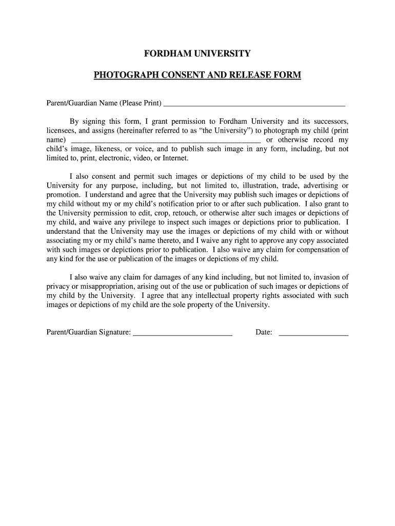 FORDHAM UNIVERSITY PHOTOGRAPH CONSENT AND RELEASE FORM Parent/Guardian Name (Please Print) By signing this form, I grant permission to Fordham University and its successors, licensees, and assigns