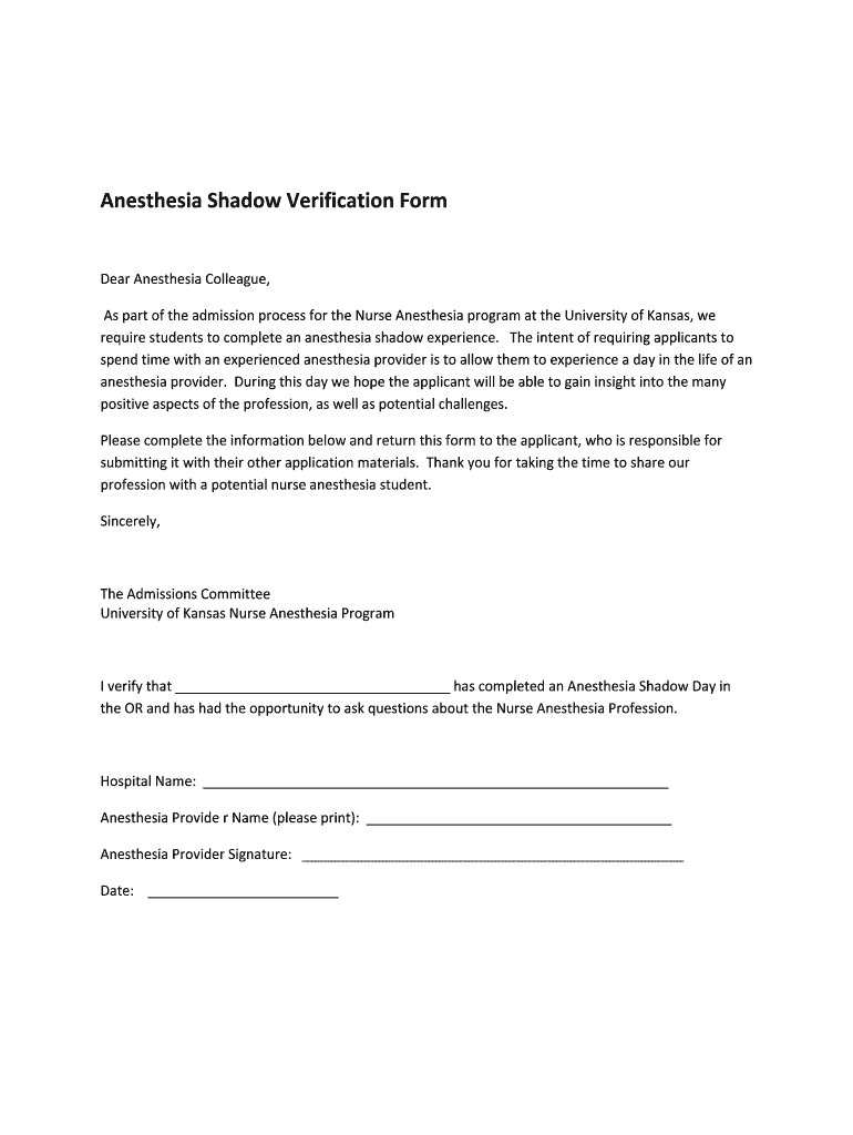 AnesthesiaShadowVerificationForm DearAnesthesiaColleague, AspartoftheadmissionprocessfortheNurseAnesthesiaprogramattheUniversityofKansas, we requirestudentstocompleteananesthesiashadowexperience.