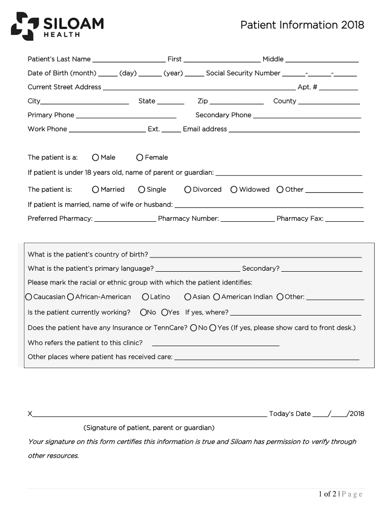 Patient Information 2018Patients Last Name First Middle Date of Birth (month) (day) (year) Social Security Number Current Street Address Apt. # City State Primary Phone Zip County Secondary Phone