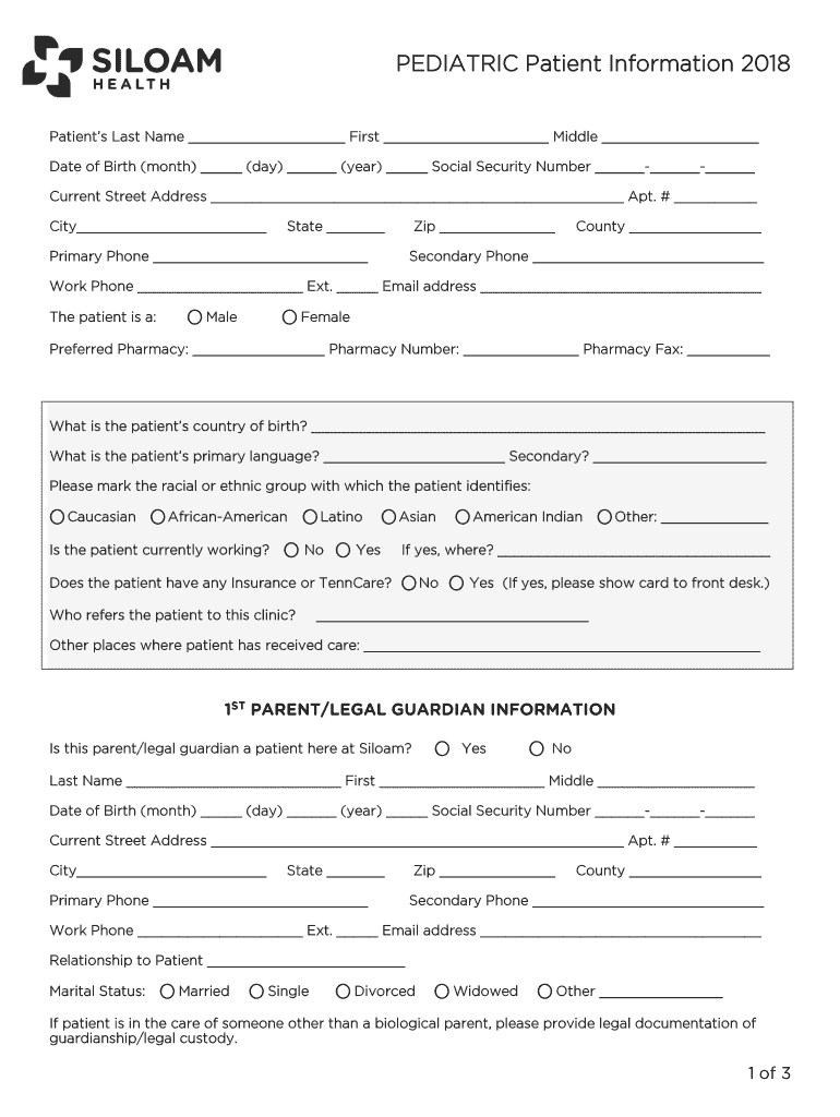 PEDIATRIC Patient Information 2018Patients Last Name First Middle Date of Birth (month) (day) (year) Social Security Number Current Street Address Apt. # City State Zip Primary Phone County Secondary