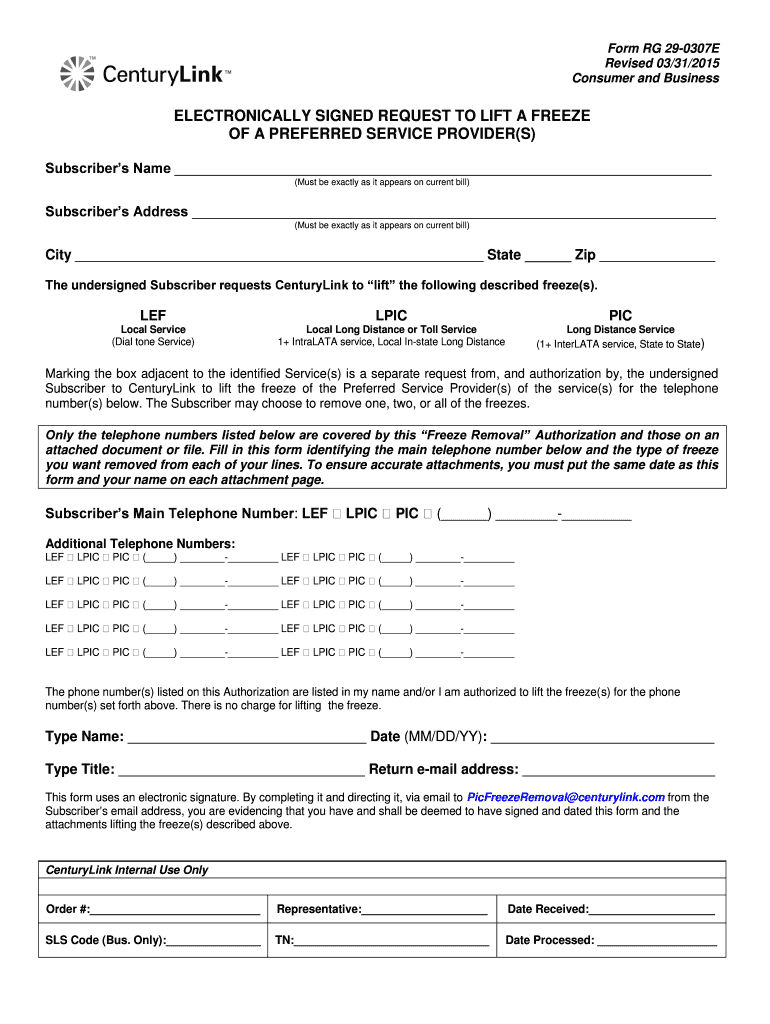 Form KG 290307E Revised 03/31/2015 Consumer and BusinessELECTRONICALLY SIGNED REQUEST TO LIFT A FREEZE OF A PREFERRED SERVICE PROVIDER(S) Subscribers Name (Must be exactly as it appears on current