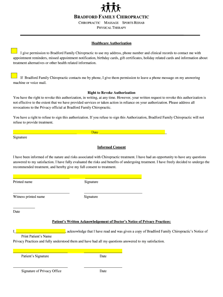 I give permission to Bradford Family Chiropractic to use my address, phone number and clinical records to