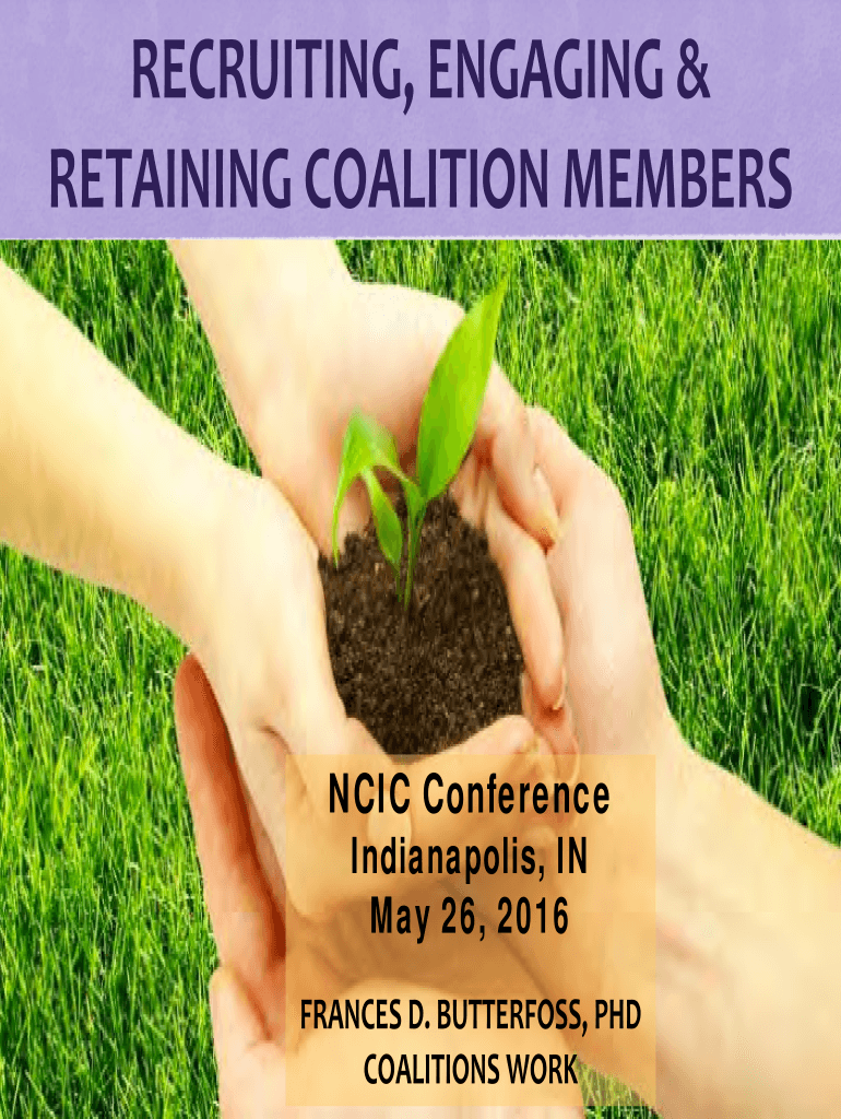 RECRUITING, ENGAGING & RETAINING COALITION MEMBERSHIP Conference Indianapolis, On May 26, 2016FRANCES D. BUTTERLESS, PhD COALITIONS WORK GO IN SEARCH OF PEOPLE. BEGIN WITH WHAT THEY KNOW. BUILD ON