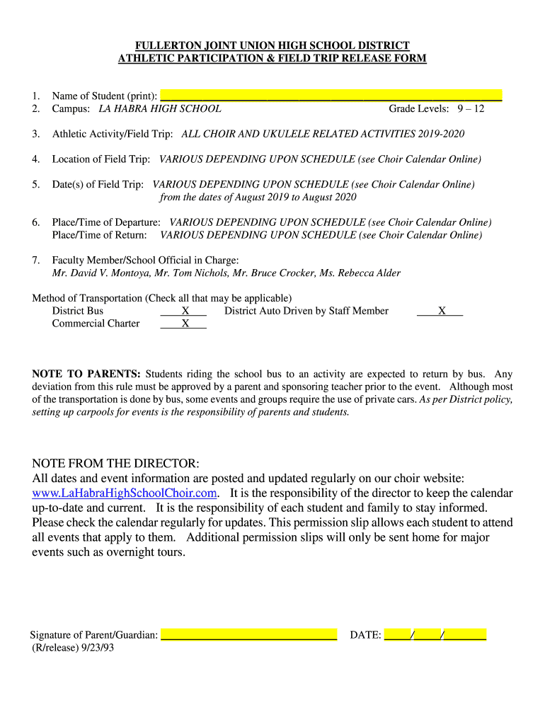 FULLERTON JOINT UNION HIGH SCHOOL DISTRICT ATHLETIC PARTICIPATION & FIELD TRIP RELEASE FORM1. 2. Name of Student (print): Campus: LA HABRA HIGH SCHOOL Grade Levels: 9 123. Athletic Activity/Field