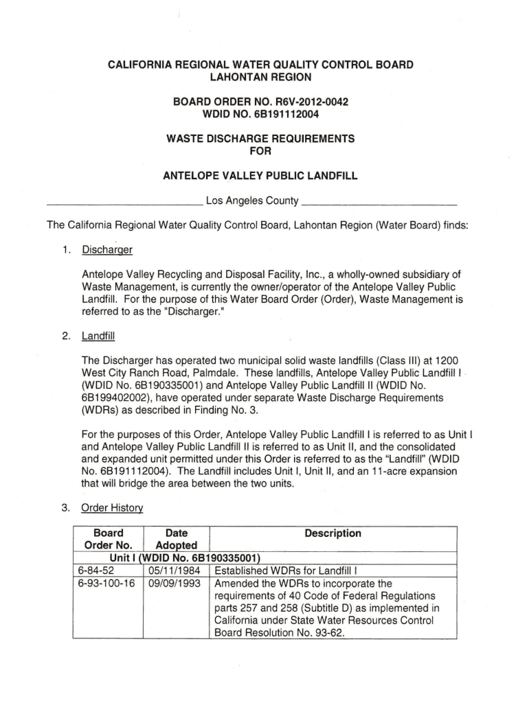 CALIFORNIA REGIONAL WATER QUALITY CONTROL BOARD LANKAN REGION BOARD ORDER NO. R6V20120042 DID NO. 6B191112004 WASTE DISCHARGE REQUIREMENTS FOR ANTELOPE VALLEY PUBLIC LANDFILL Los Angeles County The