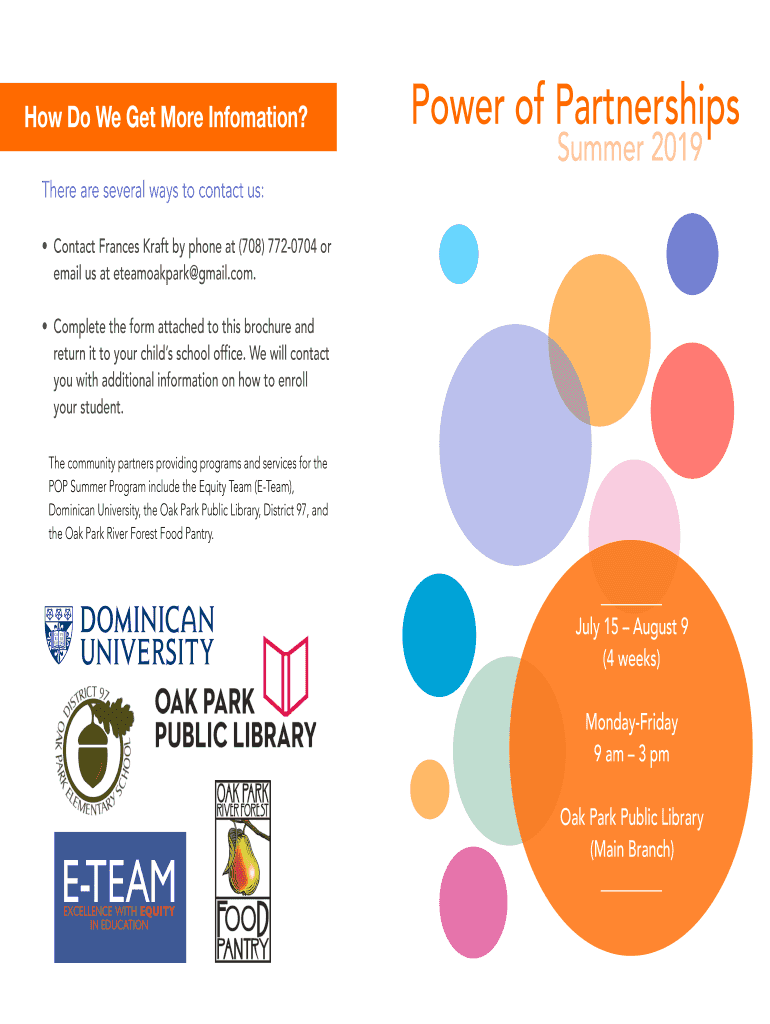 How Do We Get More Information? There are several ways to contact us:Power of Partnerships Summer 2019 Contact Frances Kraft by phone at (708) 7720704 or email us at eteamoakpark gmail.com. Complete
