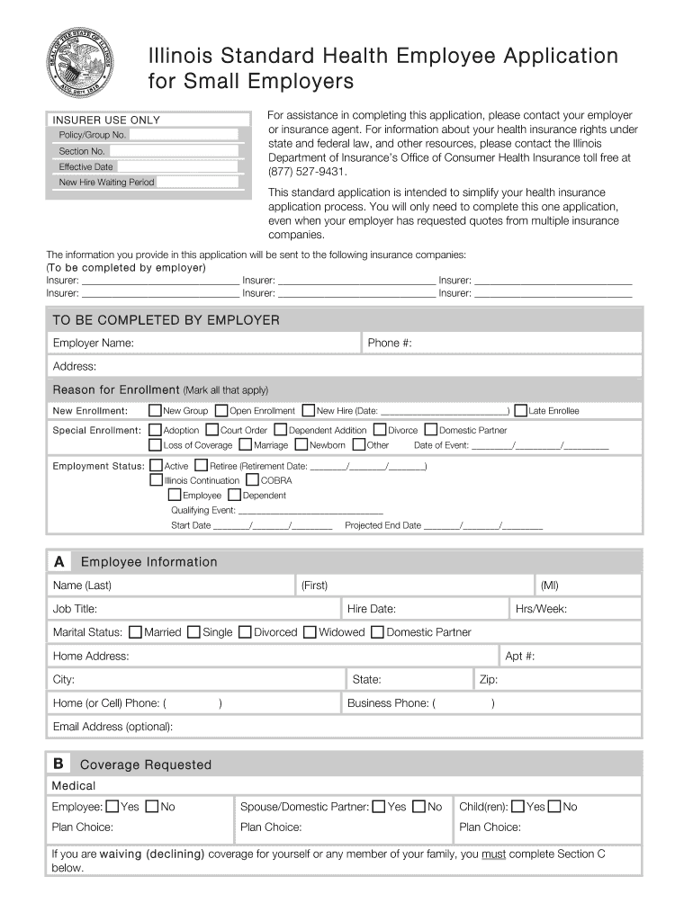 Illinois Standard Health Employee Application for Small Employers For assistance in completing this application, please contact your employer or insurance agent. For information about your health