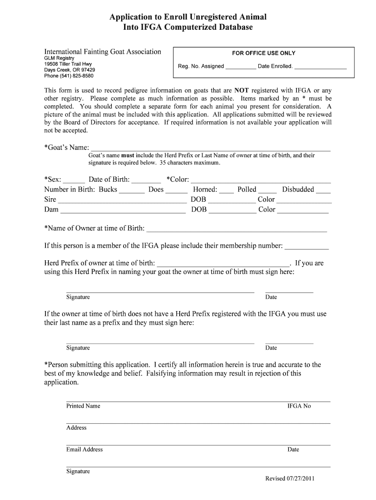 Application to Enroll Unregistered Animal Into IFA Computerized Database International Fainting Goat Association GLM Registry 19508 Tiller Trail Hwy Days Creek, OR 97429 Phone (541) 8258580FOR OFFICE