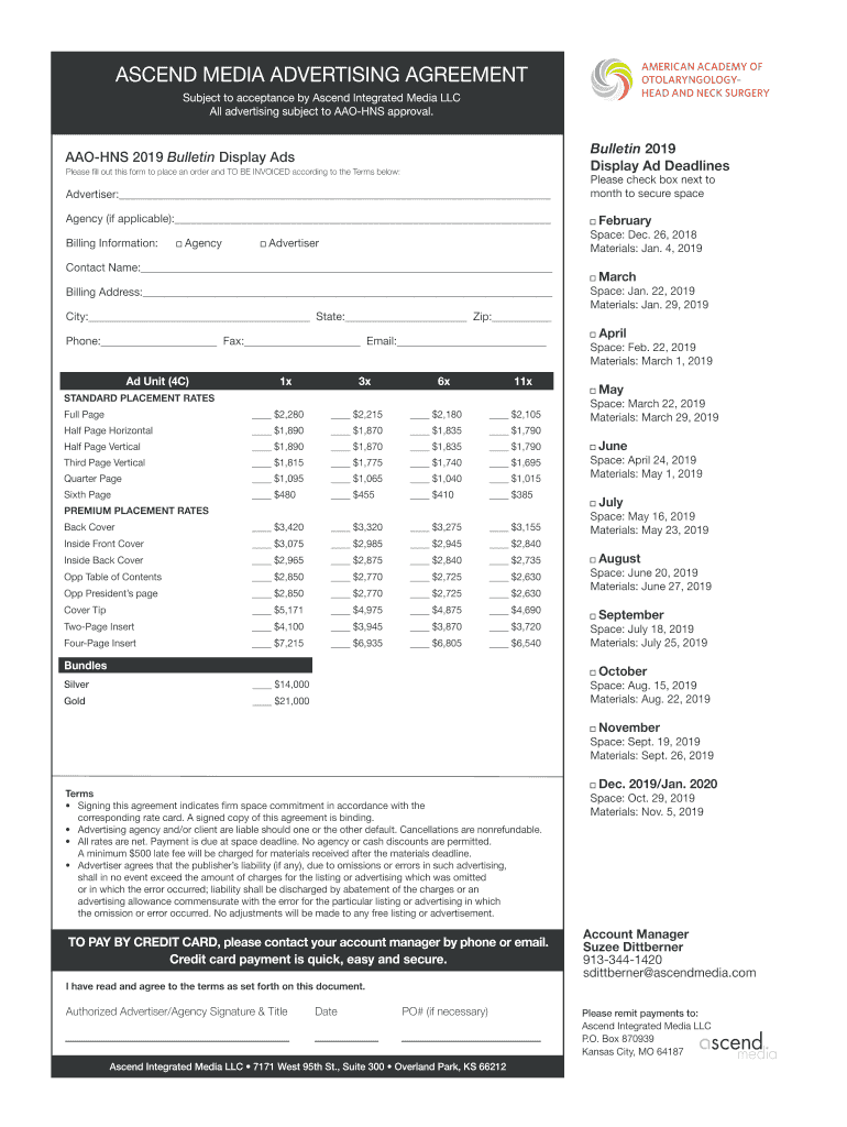 ASCEND MEDIA ADVERTISING AGREEMENT Subject to acceptance by Ascend Integrated Media LLC All advertising subject to AAO HNS approval. Bulletin 2019 Display Ad DeadlinesAAOHNS 2019 Bulletin Display