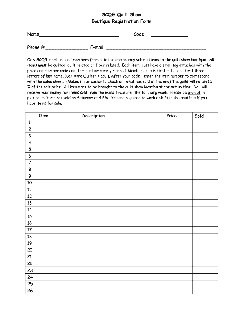 Email, fax, or share your scqg quilt show boutique form via URL. You can also download, print, or export forms to your preferred cloud storage service.