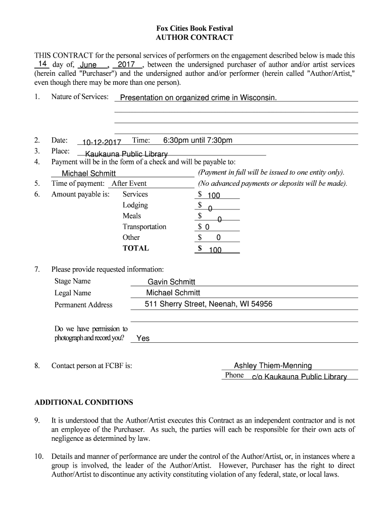 Fox Cities Book Festival AUTHOR CONTRACT THIS CONTRACT for the personal services of performers on the engagement described below is made this 14 day of,,, between the undersigned purchaser of author