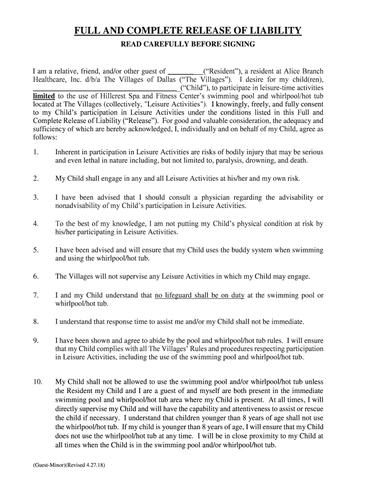 FULL AND COMPLETE RELEASE OF LIABILITY READ CAREFULLY BEFORE SIGNING I am a relative, friend, and/or other guest of (Resident), a resident at Alice Branch Healthcare, Inc. d/b/a Villages of Dallas