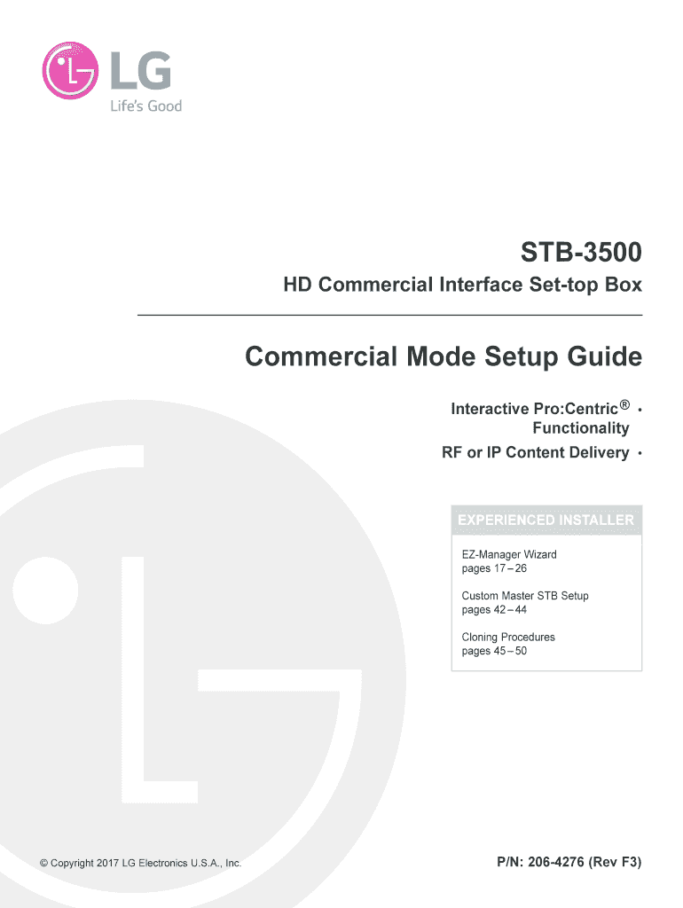 STB3500HD Commercial Interface Set top Noncommercial Mode Setup Guide Interactive Pro:Centric Functionality RF or IP Content Delivery EXPERIENCED INSTALLER Manager Wizard pages 1726 Custom Master