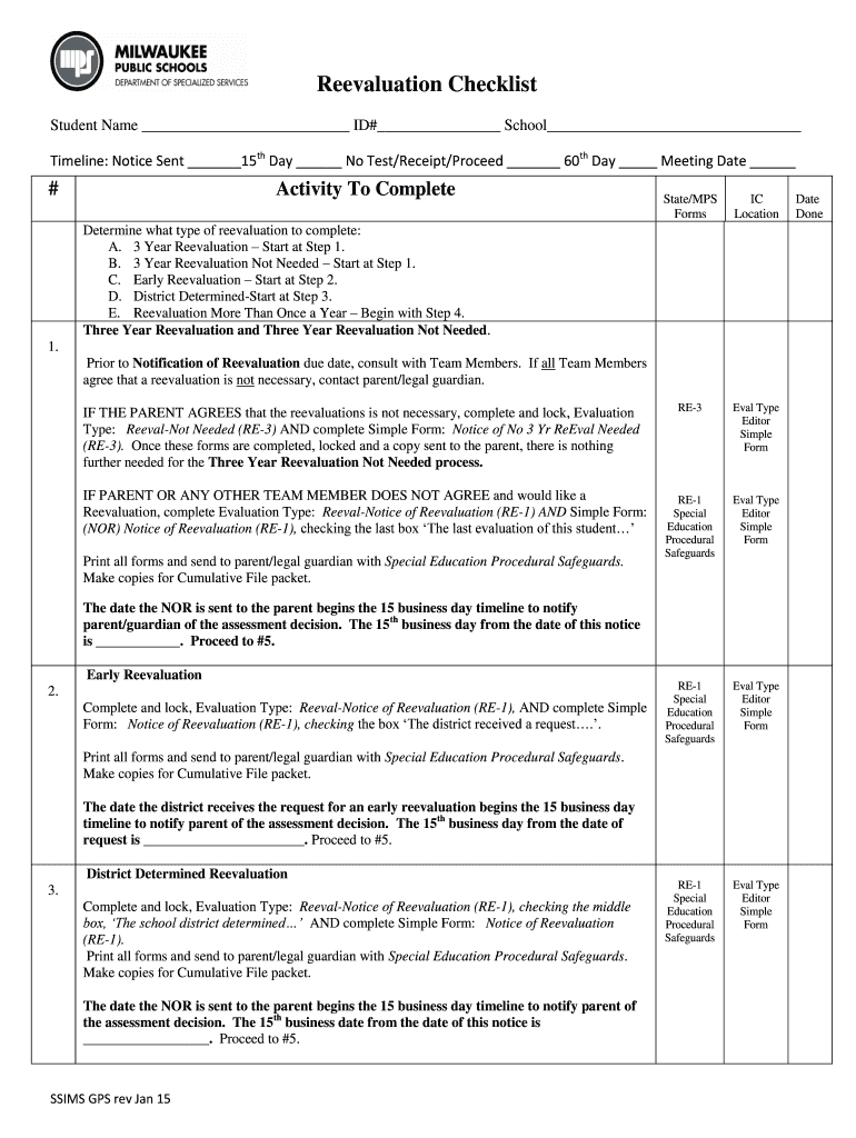 Reevaluation Checklist Student Name ID# School Timeline: Notice Sent 15th Day No Test/Receipt/Proceed 60th Day Meeting Date #Activity To The Completest ate/MPS Formic LocationRE3Eval Type Editor Simple