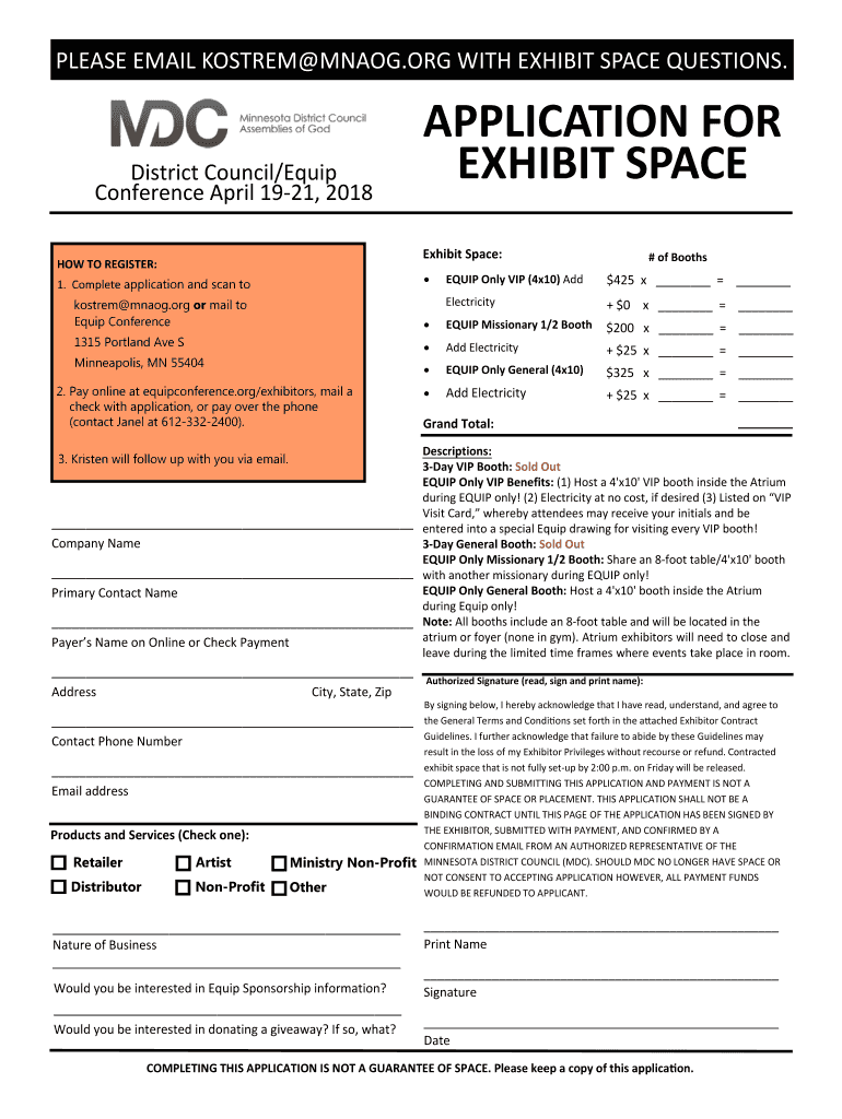 PLEASE EMAIL ROSTRUM MN AOG.ORG WITH EXHIBIT SPACE QUESTIONS. District Council/Equip Conference April 1921, 2018APPLICATION FOR EXHIBIT SPACE:HOW TO REGISTER:1. Complete application and scan to# of