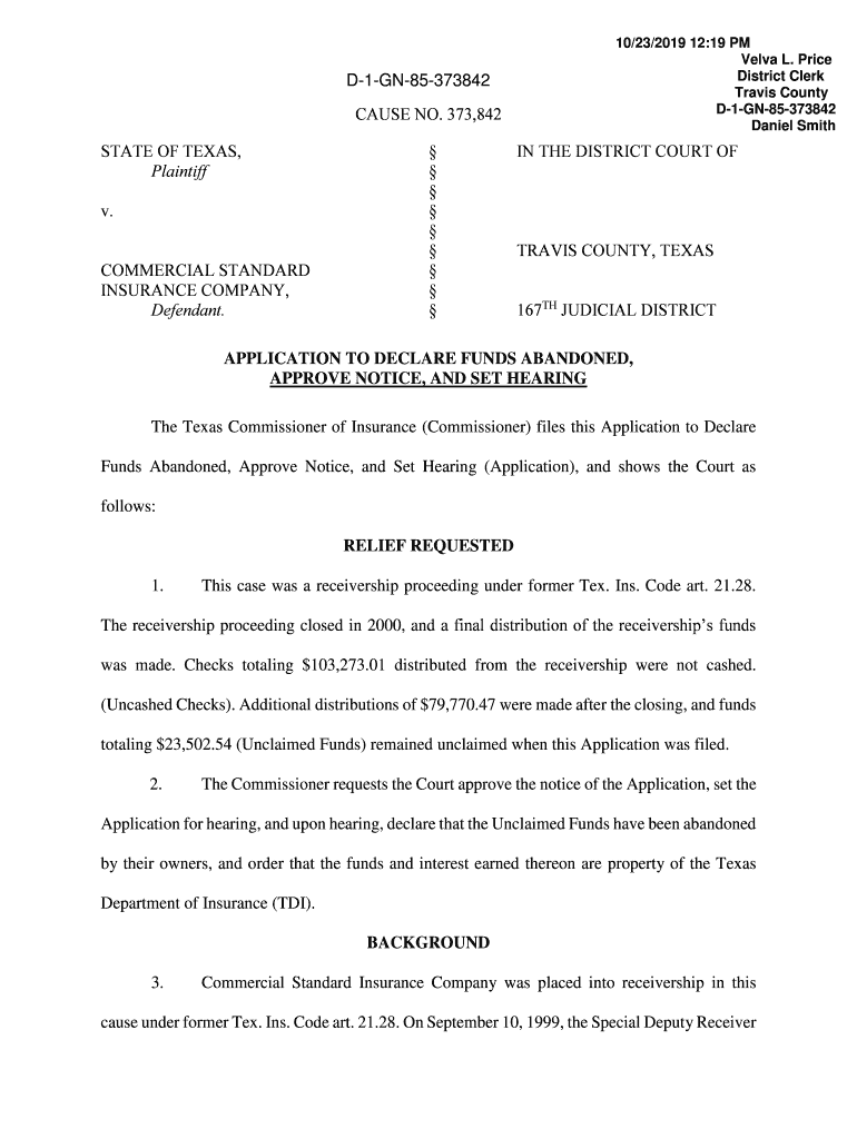 D1GN85373842 CAUSE NO. 373,842 STATE OF TEXAS, Plaintiff v. COMMERCIAL STANDARD INSURANCE COMPANY, Defendant. 10/23/2019 12:19 PM Vela L. Price District Clerk Travis County D1GN85373842 Daniel Smith