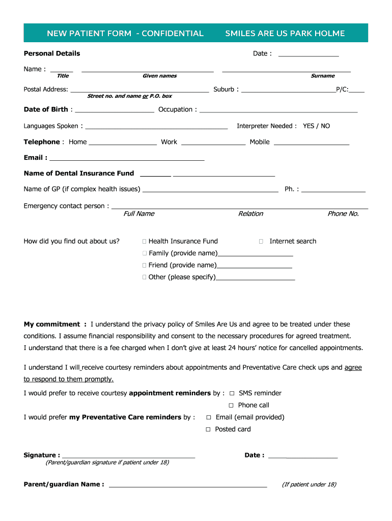 NEW PATIENT FORM CONFIDENTIALSMILES ARE US PARK HOLMEPersonal Details Name : Title Date : Given namesSurnamePostal Address: Suburb : P/C: Street no. and name or P.O. bondage of Birth : Occupation