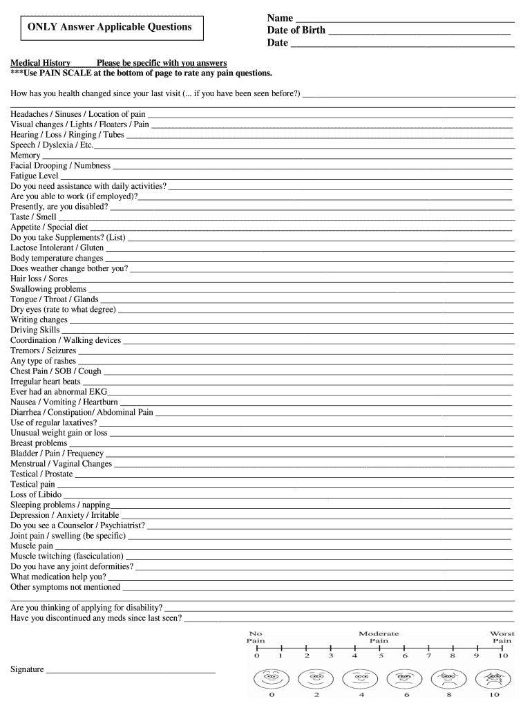 ONLY Answer Applicable Questionnaire Date of Birth Date Medical History Please be specific with you answers ***Use PAIN SCALE at the bottom of page to rate any pain questions. How have you health