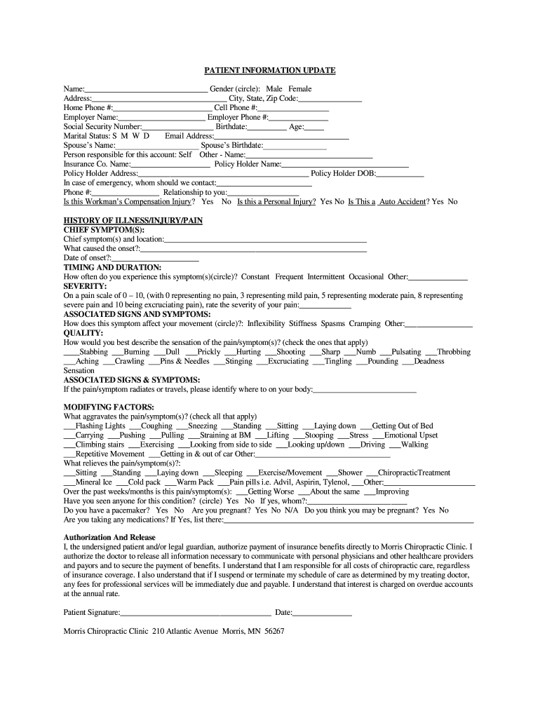 PATIENT INFORMATION UPDATE Name: Gender (circle): Male Female Address: City, State, Zip Code: Home Phone #: Cell Phone #: Employer Name: Employer Phone #: Social Security Number: Birthdate: Age: Marital