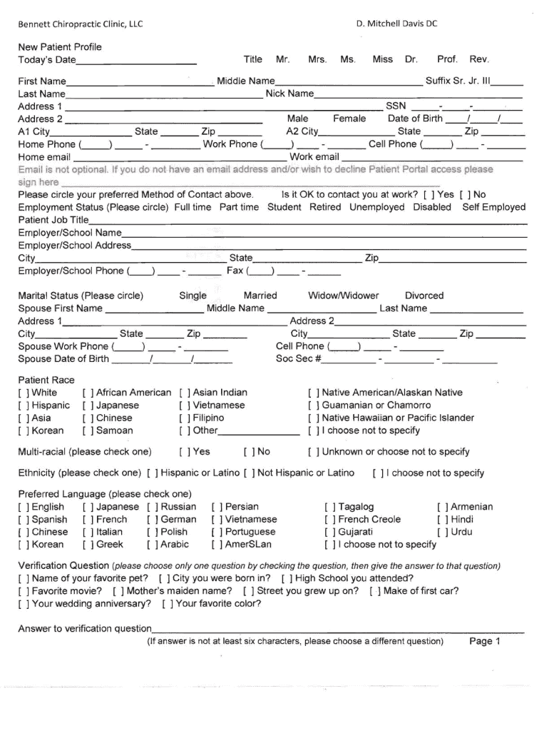 D. Mitchell Davis DC Bennett Chiropractic Clinic, New Patient ProfileToday's Date Title Mr. Mrs. Ms. Miss Dr. Prof. Rev. First Name Middle Name Suffix Sr. Jr. 111 Last Name Nick Name Address 1 SSN