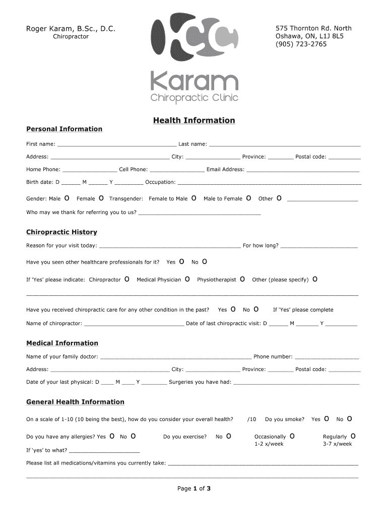 Roger Karma, B.Sc., D.C.575 Thornton Rd. North Oshawa, ON, L1J 8L5 (905) 7232765ChiropractorHealth Information Personal Information First name: Last name: Address: City: Province: Postal code: Home