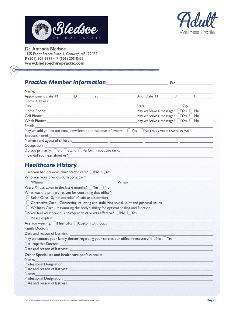 AdultWellness Profiled. Amanda Bledsoe1155 Front Street Suite 1, Conway, AR, 72032 P (501) 5046999 F (501) 2058431 www.bledsoechiropractic.comPractice Member Information File Name: Appointment Date