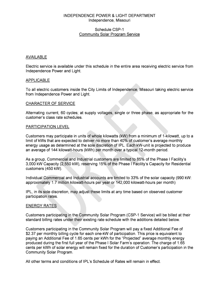 INDEPENDENCE POWER & LIGHT DEPARTMENT Independence, Missouri Schedule CSP1 Community Solar Program ServiceAVAILABLE Electric service is available under this schedule in the entire area receiving electric