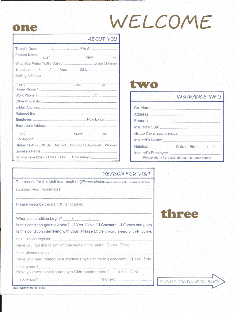 WELCOMEoneABOUT YOU Today's Date:L File #: Patient Name: ::::LAST ;:::;::::;FIRSTMIWhat You Prefer To Be Called: Birthdate: L/ 0Age: 0MaleSS#:Female Mailing Address: STATECITYHome Phone #:two ZIP