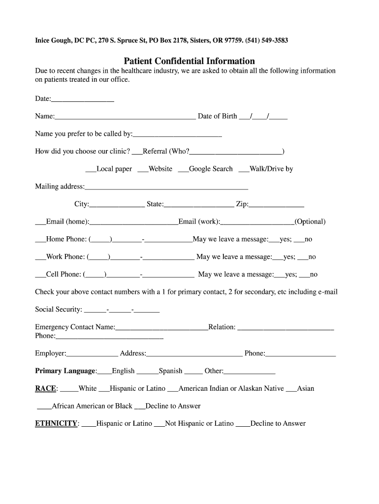 Nice Golf, DC PC, 270 S. Spruce St, PO Box 2178, Sisters, OR 97759. (541) 5493583Patient Confidential Information Due to recent changes in the healthcare industry, we are asked to obtain all the following