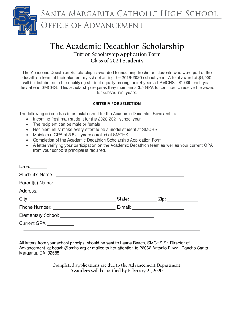 Santa Margarita Catholic High School Office of Advancement Academic Decathlon Scholarship Tuition Scholarship Application Form Class of 2024 Students Academic Decathlon Scholarship is awarded to incoming