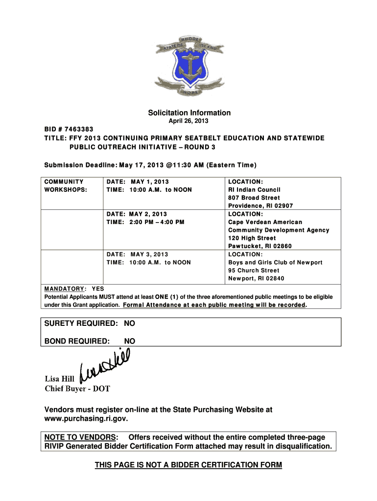 Solicitation Information April 26, 2013, BID # 7463383 TITLE: FLY 2013 CONTINUING PRIMARY SEATBELT EDUCATION AND STATEWIDE PUBLIC OUTREACH INITIATIVE ROUND 3 Submission Deadline: May 17, 2013 11:30