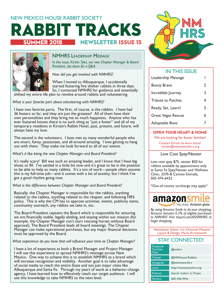 NEW MEXICO HOUSE RABBIT SOCIETYRabbit Tracks summer 2018newsletter issue 15NMHRS Leadership Message In this issue, Kirstin Tyler, our new Chapter Manager & Board President, sits down for a Quahog