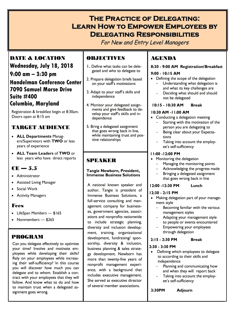 The Practice of Delegating: Learn How to Empower Employees by Delegating Responsibilities For New and Entry Level ManagersDATE & LOCATIONOBJECTIVESAGENDAWednesday, July 18, 2018 9:00 am 3:30 pm Handel