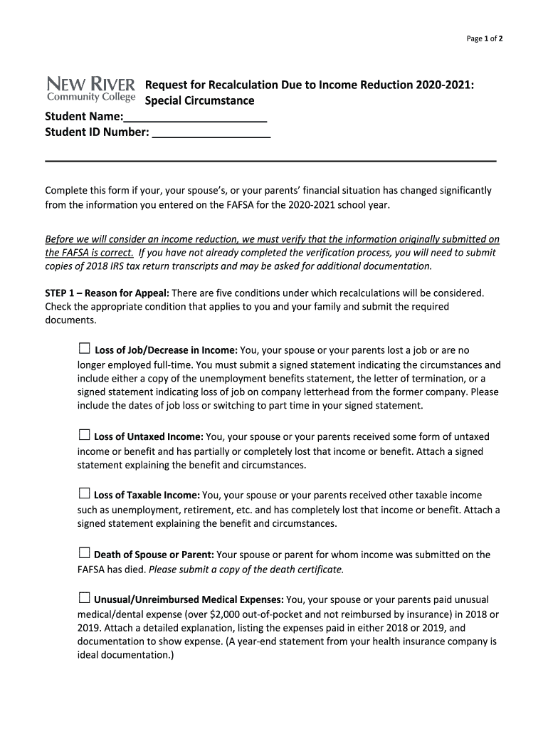 Page 1 of 2Request for Recalculation Due to Income Reduction 20202021: Special Circumstance Student Name: Student ID Number: Complete this form if your, your spouses, or your parents financial situation