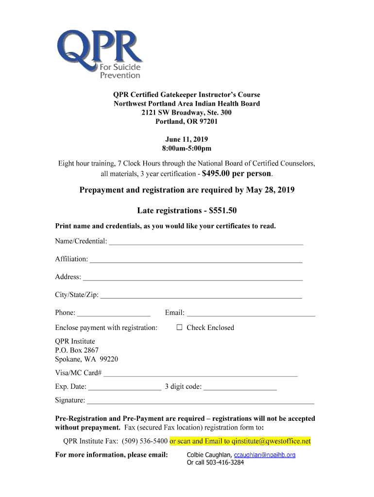 PR Certified Gatekeeper Instructors Course Northwest Portland Area Indian Health Board 2121 SW Broadway, Ste. 300 Portland, OR 97201 June 11, 2019 8:00am5:00pm Eight-hour training, 7 Clock Hours through