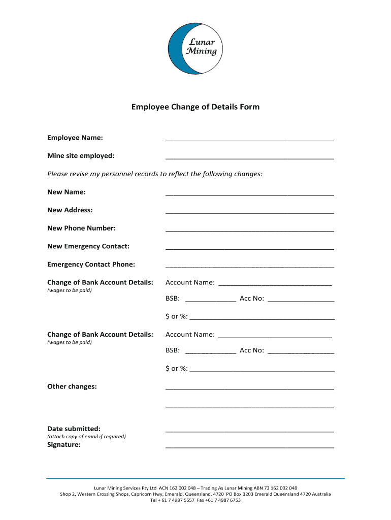 Employee Change of Details FormEmployee Name: Mine site employed: Please revise my personnel records to reflect the following changes: New Name: New Address: New Phone Number: New Emergency Contact: