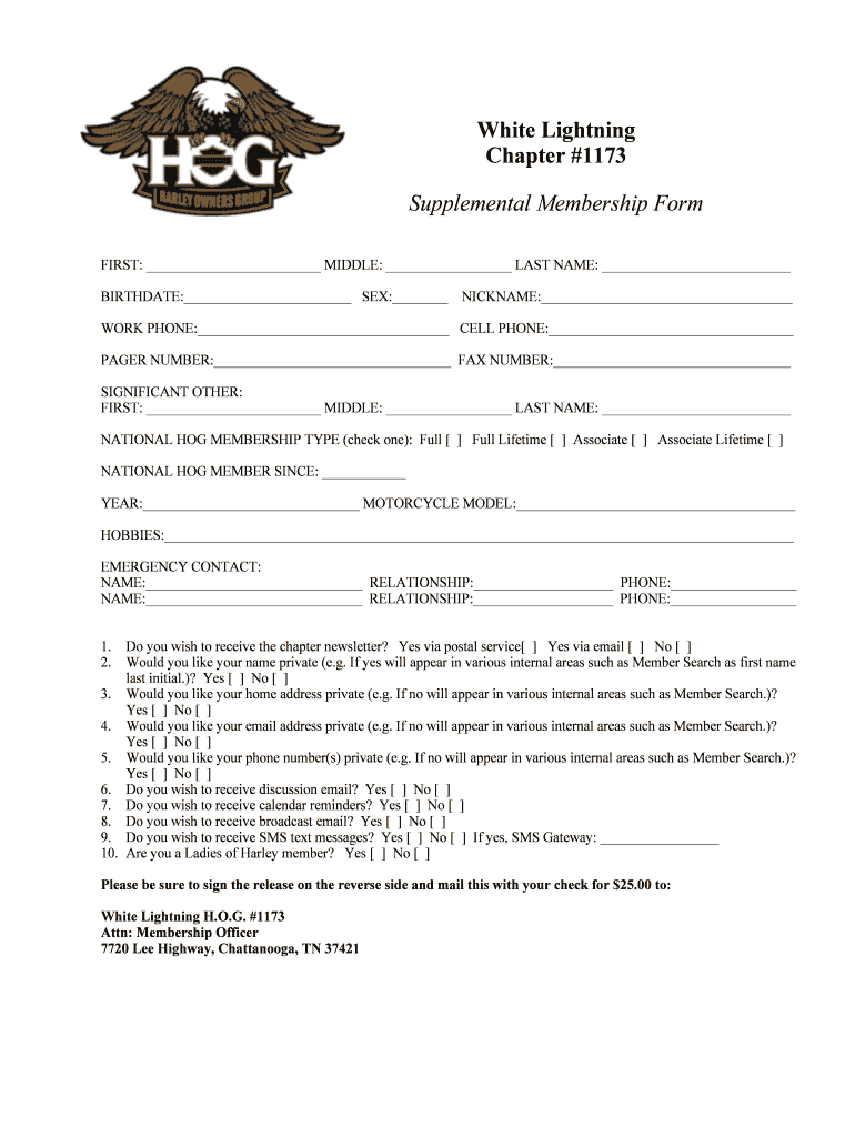 White Lightning Chapter #1173 Supplemental Membership Form FIRST: MIDDLE: LAST NAME: BIRTHDATE: SEX: NICKNAME: WORK PHONE: CELL PHONE: PAGER NUMBER: FAX NUMBER: SIGNIFICANT OTHER: FIRST: MIDDLE: LAST