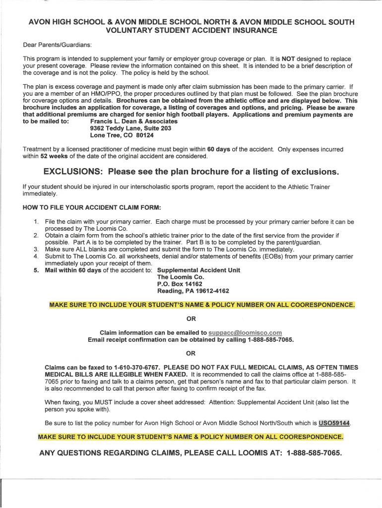 AVON HIGH SCHOOL & AVON MIDDLE SCHOOL NORTH & AVON MIDDLE SCHOOL SOUTH VOLUNTARY STUDENT ACCIDENT INSURANCE Dear Parents/Guardians: This program is intended to supplement your family or employer group