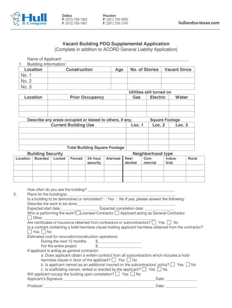 The Vacant Building PDQ Supplemental Application is a business form used by property owners and insurance producers to provide additional information about a vacant building for insurance purposes.